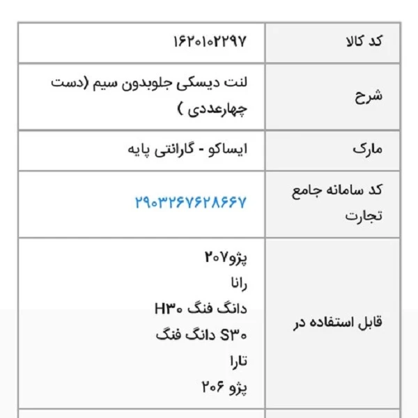 لنت ترمز چرخ جلو,مناسب برای خودروی پژو 206 تیپ 5 و پژو 207 میباشد. این لنت تولید شده درخط تولید ایران خودرو (ایساکو) و همچنین دارای لیبل اصالت ایساکو می باشد. در بین لنت های موجود در بازاری که پر شده از قطعات کپی و فیک میتوان گفت لنت شرکتی ایساکو(سفید) از کیفیت قابل قبولی برخوردار است, همچنین با داشتن لیبل اصالت بر روی بسته, مشتری میتواند بااستعلام آن از طریق پیامک و سایت ایساکو به اصالت قطعه پی ببرد. این محصول کاملا اصلی و اورجینال میباشد.تصویر استعلام بارکد روی لنت جهت اطمینان شما مشتریان عزیز از اصالت قطعه را در سایت قرار داده ایم.با خیال راحت خرید کنید.